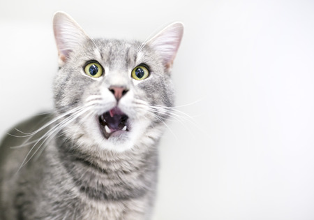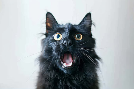 Close up of a black cat with wide eyes and open mouth expressing surprise or curiosity. A white background highlights the cats bright black fur and expressive face