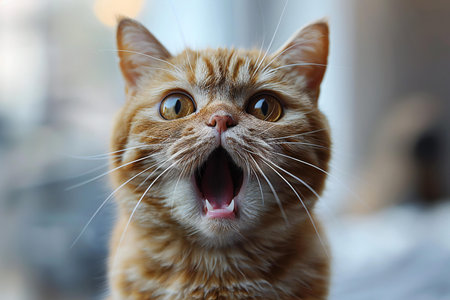 A cat with its mouth open and eyes wide open. The cat is orange and has a fluffy tail