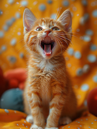 Close-up of cute ginger cat with wide open mouth, wide photo