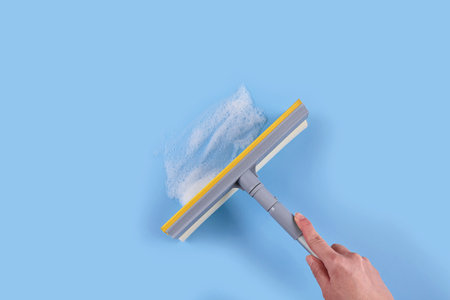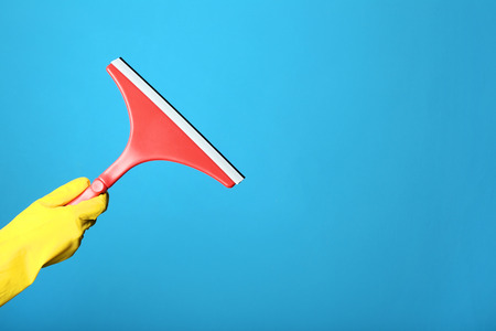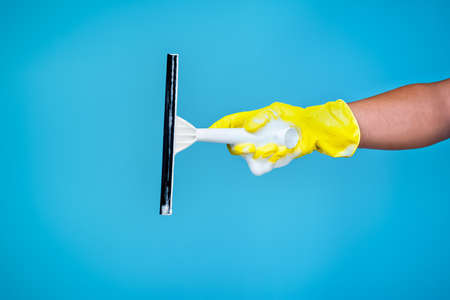 Female hand holding cleaning tool for windows on blue background
