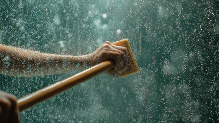 Womans hand holding window cleaning mop