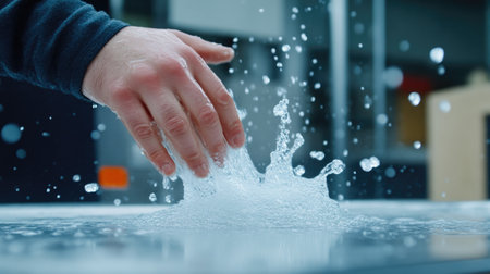 A person is scrubbing a surface with a sponge, creating splashes of water and soap bubbles in a well-lit environment, emphasizing the cleaning action.