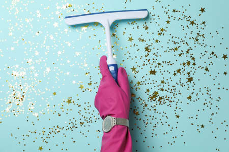 Hand with clock hold squeegee on blue background with glitter