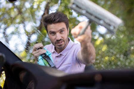 happy young man cleaning car window