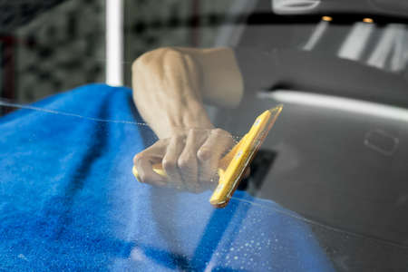 Service station worker installing PPF on windshield using squeegee