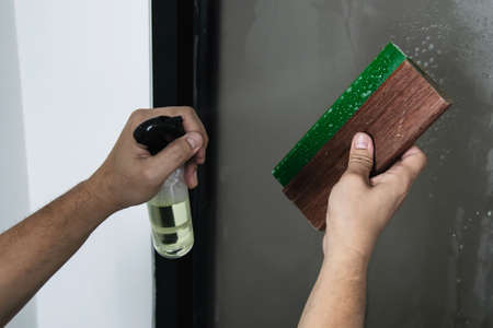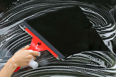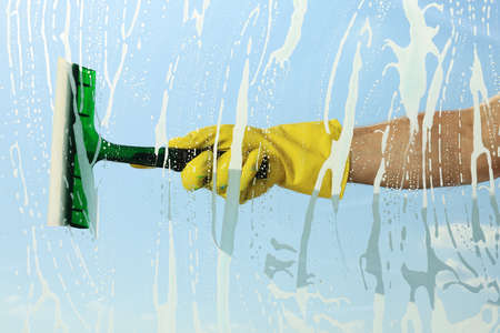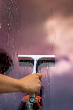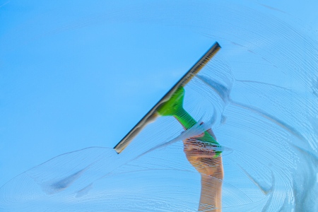 Cleaning conept - hand cleaning glass window pane with detergent and rubber aluminium wiper