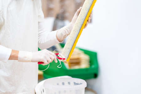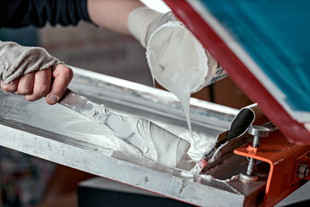 selective focus photo of male hands with spatula and can of white paint. serigraphy production. printing images on t-shirts by silkscreen method in a design studio