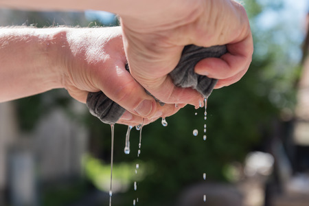 Hands squeeze wet fabric against blue sky.
