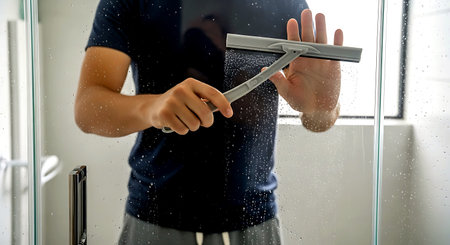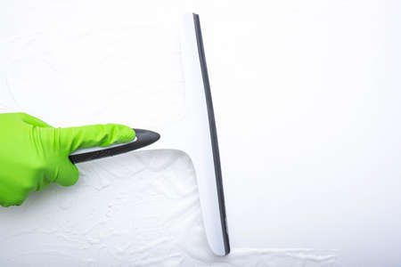 Hand in white glove using a black squeegee to clean a surface. Water droplets and streaks are visible on the gray background.