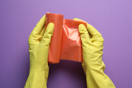 Janitor in rubber gloves holding roll of orange garbage bags over purple background, top view