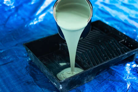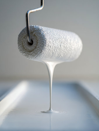 A close-up shot showcases a textured paint roller coated with glossy white paint, mid-drip into a pristine tray, set against a smooth, creamy-toned background.