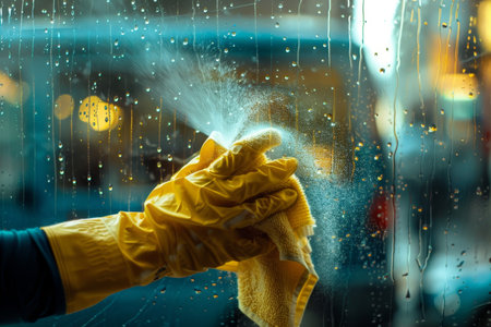Experienced hand meticulously cleans window with cloth and spray for exceptional quality outcome