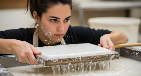 An artisan performs the traditional craft of papermaking,carefully lifting a screen frame from a large vat of pulp slurry. Water drips from the newly formed sheet of paper,showcasing a meticulous,hands-on process in a workshop setting.