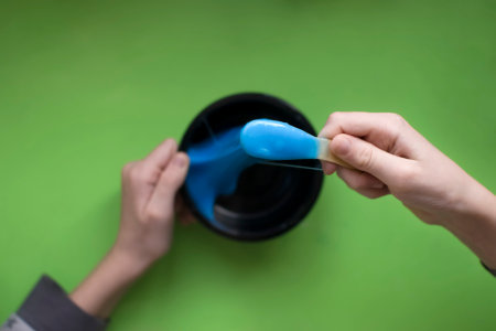 Young artist carefully pouring blue paint from a jar onto his hand, expressing creativity and passion for art