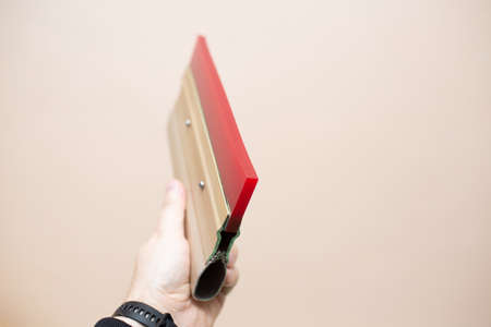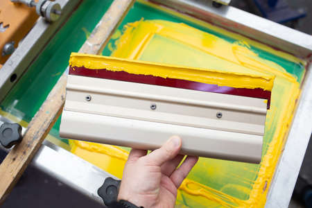Squeegee for Serigraphy silk screen print process at clothes factory. Frame, squeegee and plastisol color paints.