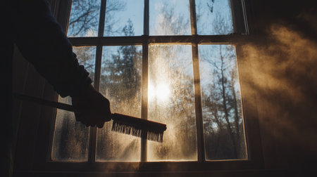 This image captures a peaceful moment of cleaning a dusty window, illuminated by soft sunlight, creating a warm atmosphere perfect for depicting home care routines.
