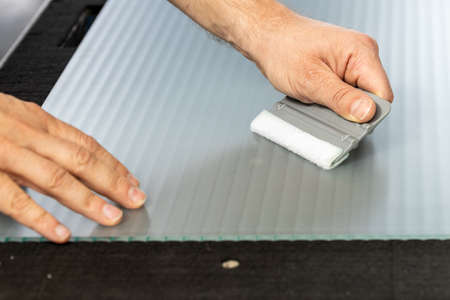 close-up male hand - glass cleaning tool