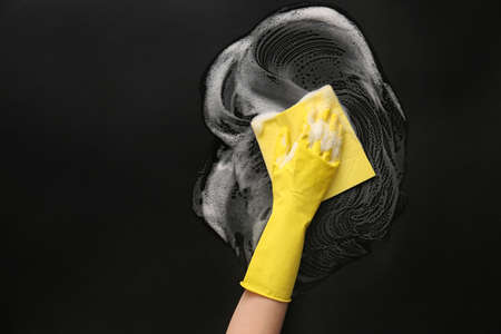 Hand of woman cleaning dark table