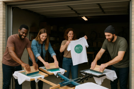 Four young entrepreneurs printing t shirts with a manual screen printing machine in a garage, showing their finished products