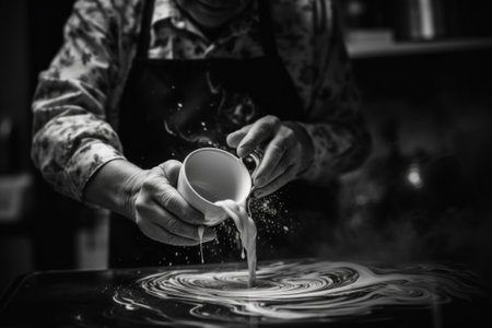 A person pouring something into a cup on a table. Generative AI image.