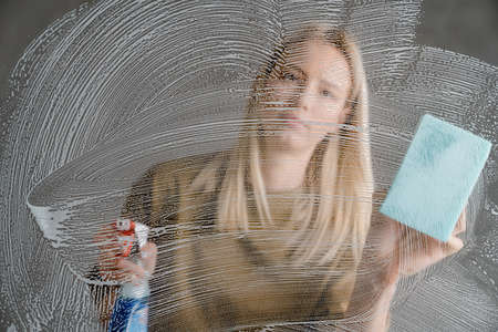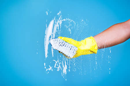 Cleaning conept - hand cleaning glass window pane with detergent