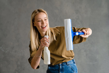 Happy european woman cleaning glass with streak and spray isolated over grey wall