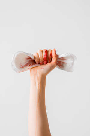 Womans fist as symbol of feminism with used menstrual pad, concept photography for feminist blog or poster