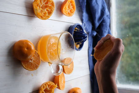 Freshly squeezed orange juice in a cup. fresh fruits of oranges and tangerines on a white table.