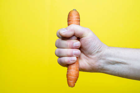Close-up of hand gesture of picking up something. Male hand holding something invisible isolated on yellow background.