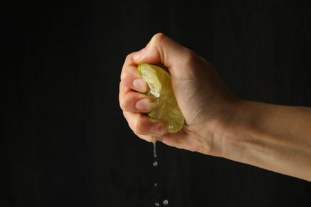 The hand of a man squeezes juice from half a lime. Juicy drop hanging down. Isolate on black background.