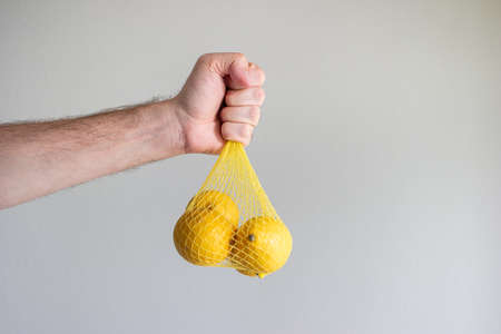 Fresh ripe yellow lemons in a bag held in hand by Caucasian male hand. Isolated studio shot.
