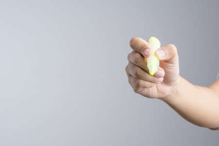 Hand holding Yellow highlighter for writing a color word marker on white background