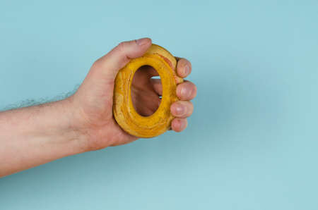The hand is clutching a yellow rubber band on a blue background. Adult male holding a hand-held round hand trainer. Side view. Sports, active lifestyle.