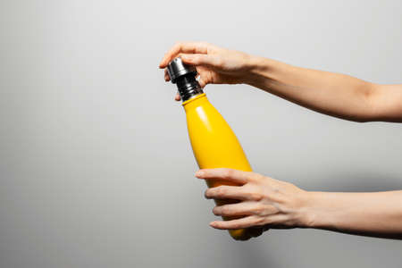 Close-up of female hands holding steel reusable thermo water bottle of yellow color on grey background.