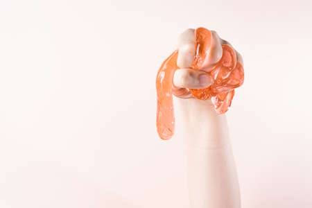 Woman squeezing colorful slime on red background, closeup. antistress toy