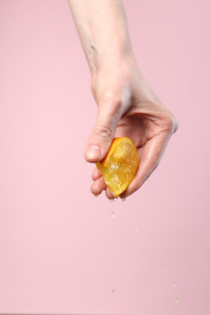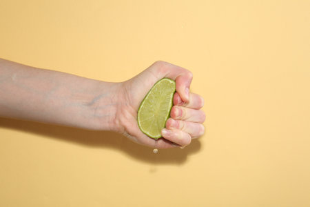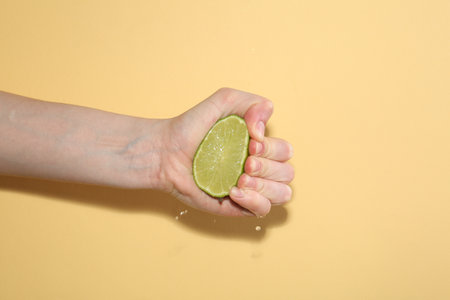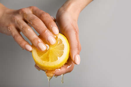 Hand of a woman with yellow fingernails squeezing half a lemon for juice with yellow background.