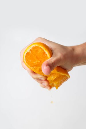 Strong female hand pressing orange half isolated on white background. Cropped shot, closeup. Natural juice or organic food concept