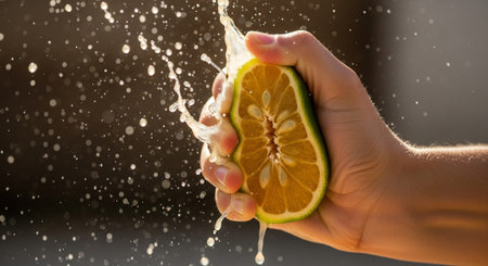 Macro photo of an orange squeezed with a hand. Orangejuice. Side photo. Citrus fruit juice. Natural juices.