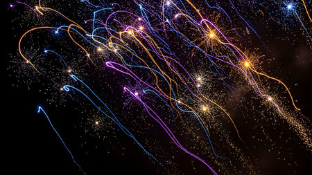 An abstract display of colorful light trails and sparks exploding against a dark background. The vibrant neon swirls of blue, purple, and gold create a dynamic and energetic visual resembling fireworks or fiber optics.
