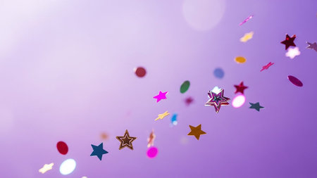 Vibrant showing explosion of colorful confetti streamers and star shapes in vibrant reds blues purples yellows and gold against a blurred background creating a...