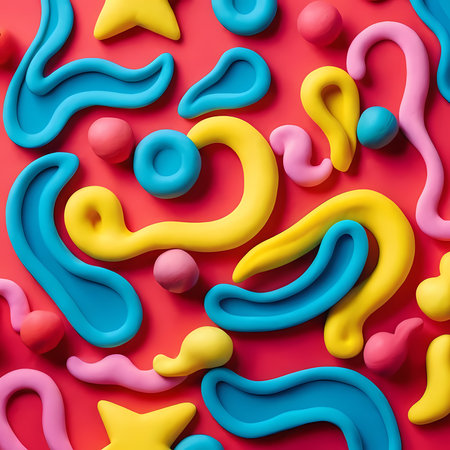 A lively assortment of colorful clay shapes lies on a bright background, inspiring imaginative play and artistic creation in a cheerful atmosphere.