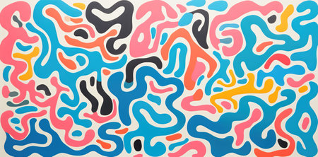 Brightly colored shapes and swirls create an engaging display against a bold red backdrop. This artistic arrangement invites creativity and imagination through playful design.