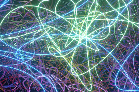 Neon grow lights, messy colorful string. For graphic design, catalog, texture or background. 3D render.