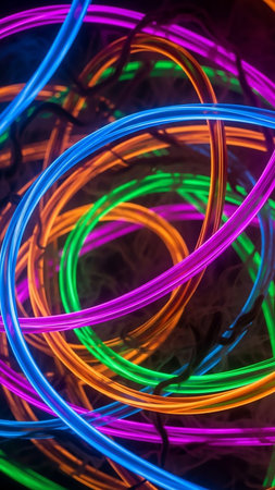 With showing close-up macro view of tangled neon glow wires in vibrant blue orange green and pink creating an abstract swirling pattern with dark smoky background...