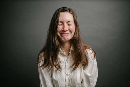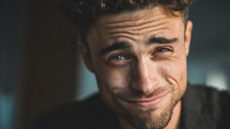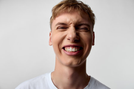 Close up of a young man with a wide grimace showing teeth, conveying intense emotion and awkward energy, studio light, plain background, raw facial expression highlighting mood and spontaneity