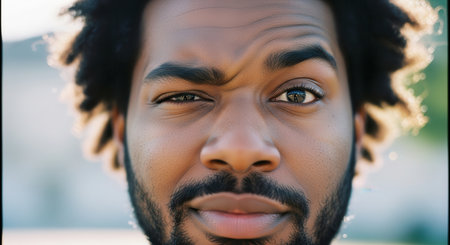 Close up of a black man with a beard and curly hair, winking one eye and raising an eyebrow, conveying curiosity and skepticism.