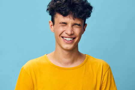Happy young man smiling with closed eyes, wearing a yellow t shirt on a light blue background, expressing joy and positivity in a bright and cheerful atmosphere