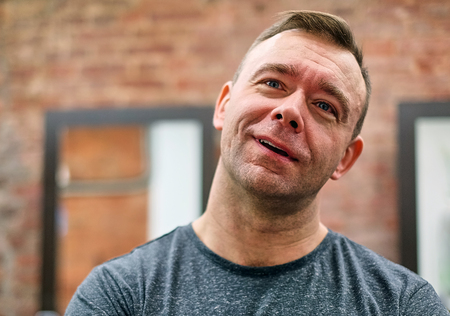 A man of ordinary appearance unshaven laughs and looks at the camera on a gray background. A man in his forties.