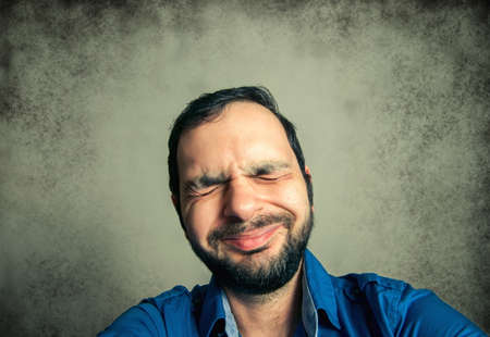 A close-up portrait shows a man with closed eyes, exhibiting a wide smile against a light blue backdrop. The image displays a man with dark hair, a beard, and a neutral-colored shirt. This image is suitable for various commercial uses, including advertising and editorial content.