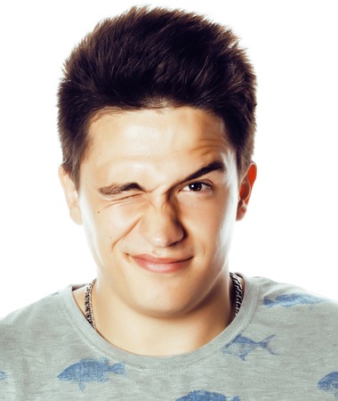 Young African boy with funny expression winking looking warily at the camera, isolated on white background